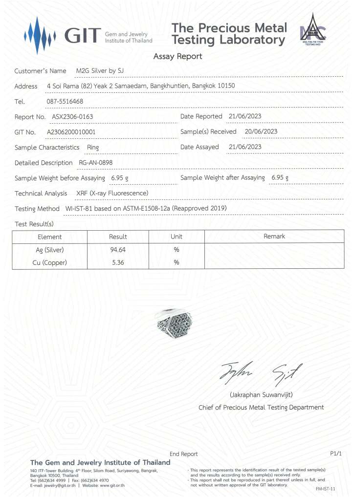 At M2G Silver by SJ, quality and authenticity come first. Our silver jewelry is officially certified by the Gem and Jewelry Institute of Thailand (GIT), ensuring every piece meets international standards for purity and craftsmanship. With certified results showing 94.64% pure silver, our customers can trust in the excellence of every creation.